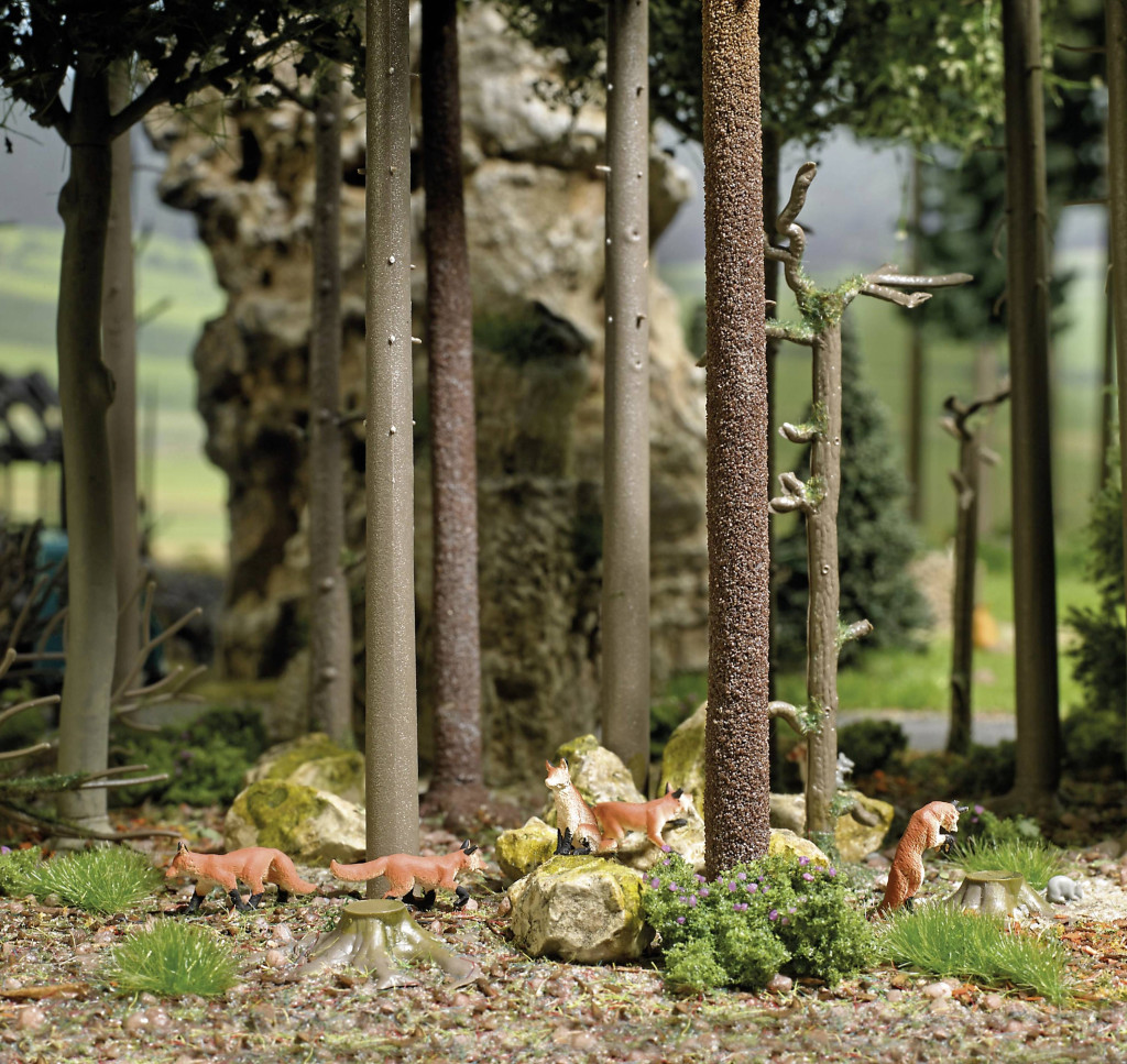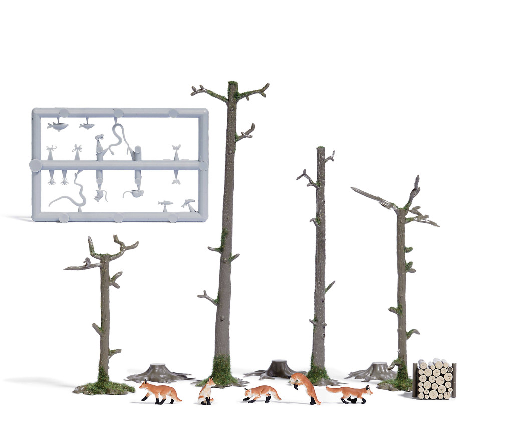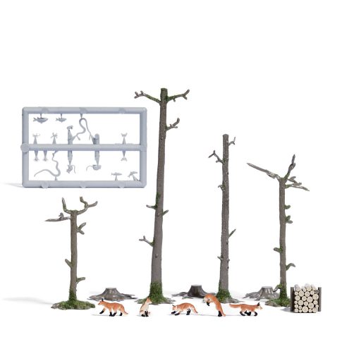 Rókacsomag, amely 5 különböző méretű és pozíciójú vörös rókából áll. Tartalmazza még: 4 mohával borított fatörzs gyökerekkel, 3 különálló gyökér, faköteg és apró állatok, melyeket kifesthetsz.