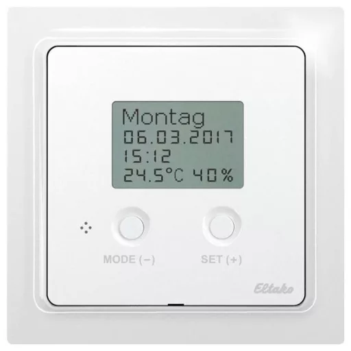 Buszóra termosztát higrosztát antracit matt kijelzővel a BGW14 RS485 busz átjáróhoz való csatlakozáshoz. Egyedi vagy az E-Design55 kapcsolórendszerbe történő beszereléshez. 80x80mm, 14mm magas. Beépítési mélység: 33mm Állítható nappali és éjszakai célhőmérsékletekkel és célpáratartalommal. Megvilágított kijelző. Alapértelmezés szerint használatra kész. Az adatátvitel és a tápellátás 12V DC kapcsolóüzemű tápegységgel a 4 vezetékes buszon keresztül történik. Készenléti veszteség mindössze 0,1 watt. Intelligens otthon érzékelő.