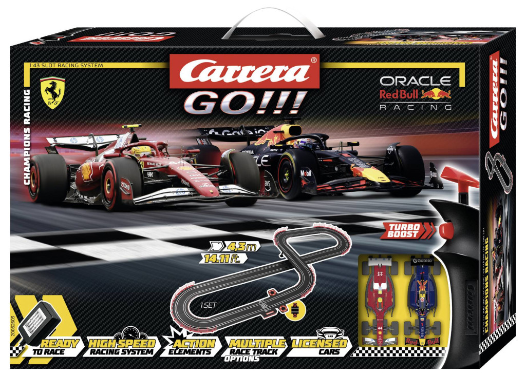 Carrera GYEREK!!! A „Bajnokok versenye” készlet többről szól, mint pusztán a sebességről – ez két Forma-1-es legenda találkozása. A 4,3 méter hosszú pályán az Oracle Red Bull Racing RB21 „M. Verstappen, No.1” és a Ferrari SF-25 „L. Hamilton, No.44” izgalmas párharcokat vív, amelyek nemcsak a rajongókat, hanem a pilótákat is a határaikig feszegetik. A pálya precíz manővereket és villámgyors reakciókat igényel. A turbó kézi vezérlőkkel a versenyzők maximális teljesítményt hozhatnak ki gépeikből, és maximális sebességgel száguldanak a nagy sebességű egyenesekben. Minden pillanat ezen a pályán igazi Forma-1-es élmény, ahol csak egy dolog számít: Ki marad higgadt és tartja meg a vezetést?