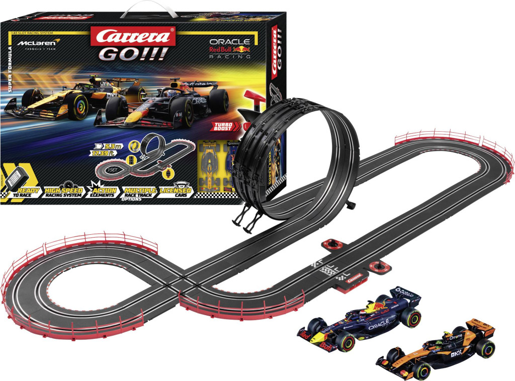 A Carrera Go-val!!! A „Super Formula” szettben Max Verstappen az Oracle Red Bull Racing RB21 „M.” versenyautóval ült. Verstappen (1-es rajtszám) és Lando Norris a McLaren MCL39 " L" -ben. Norris, a 4. számú játékos izgalmas párharcai. Az 5,3 méter hosszú, nagy sebességű egyenesekkel, látványos kanyarokkal és egy hurokkal tarkított pályán a fiatal versenyzők megtapasztalhatják, hogy maguk is a Forma-1 világának részei. A gondosan megtervezett járművek igazi versenyzési lázat keltenek, míg a szoros párharcok és az izgalmas előzési manőverek emelik az adrenalinszintet. Világbajnoki fölény találkozik egy feltörekvő tehetség küzdőszellemével - ez a szett sebességet, akciót és tiszta versenyszellemet hoz a pályára. Tökéletes választás bárki számára, aki szereti a Forma-1 izgalmát!