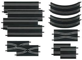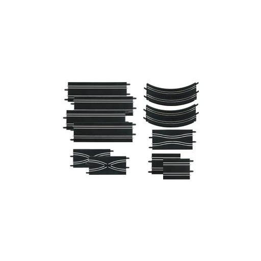 Szállítás tartalma: 4 db egyenes 342 mm · 2 db egyenes 114 mm · 2 nyomsávváltás · 1 db útszűkület · 2 db felüljáró oszlopokkal.