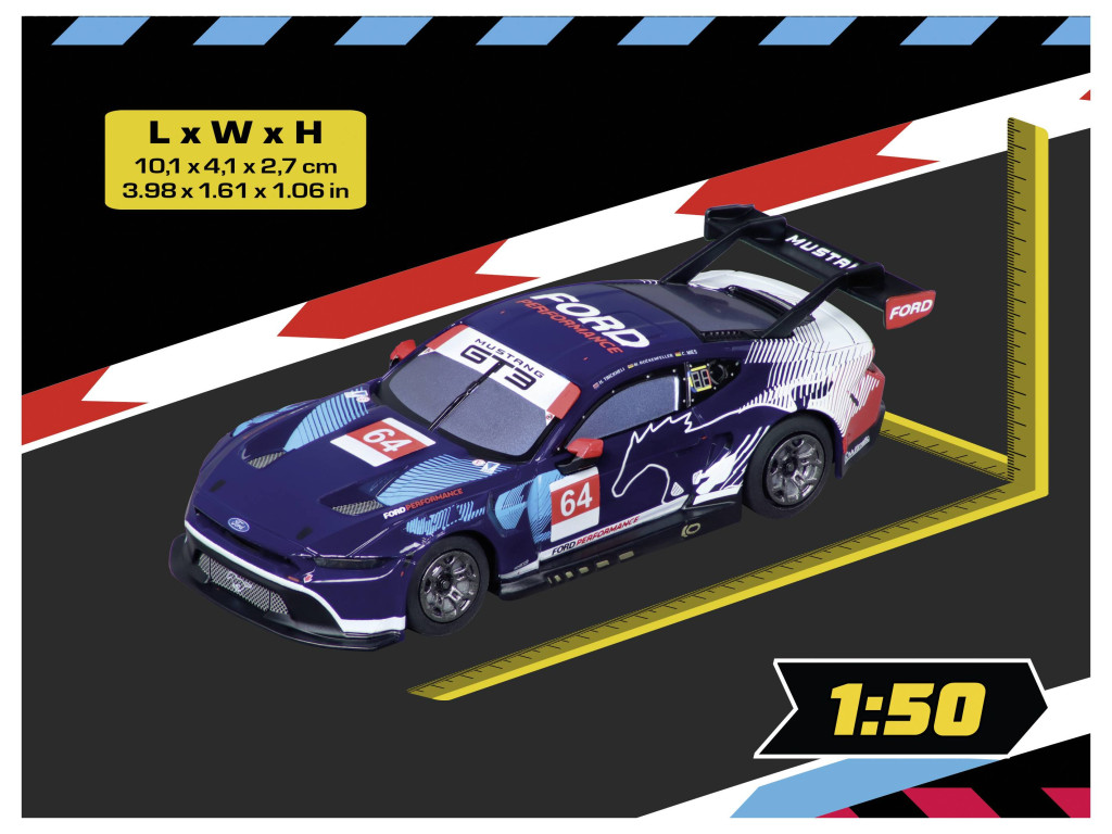Tapasztald meg a távirányítású Carrera Hybrid Ford Mustang GT3 " Ford Performance, No.64" versenyautót 1:50 méretarányban - hűen tükrözi a részleteket és lenyűgöző funkciókat kínál. A jármű lenyűgöző első és hátsó lámpáival, és mind a Carrera Hybrid pályán, mind szabadon a térben is vezethető. Méretarányos vezetési jellemzőinek köszönhetően a modell ugyanolyan valósághűen vezet a versenypályán, mint az eredeti, akár 1,8 m/s végsebességgel. Egy nagy teljesítményű lítium akkumulátor akár 30 percnyi versenyzési élményt biztosít, és mindössze 20 perc alatt újratölthető egy USB-C kábellel. A mobilalkalmazás-vezérlésnek, a valósághű motorhangnak és a számos testreszabási lehetőségnek köszönhetően ez a modell minden autóverseny-rajongó számára a legjobb vezetési élményt nyújtja!