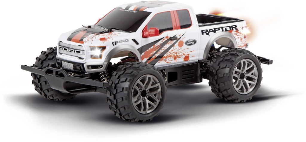 Ez a jármű igazi profi. A Carrera RC Ford F-150 Raptor a kizárólag engedéllyel rendelkező Ford kivitelben nemcsak vizuálisan hat az egész területen. A körülbelül 27,5 cm hosszú jármű burkolata alatt a 2,4 GHz-es technológia, az első és féklámpák, valamint a digitális arányos vezérlés mellett számos egyéb műszaki jellemző is található. Összkerékhajtásának és olajnyomásos lengéscsillapítójának köszönhetően az egyenetlen terep sem jelent problémát ennek az erőműnek! Akár 50 km / h maximális sebességgel a Carrera RC Ford F-150 Raptor egyszerűen elrugaszkodik mindenkitől! Világos: ez a jármű nem a gyenge szívének szól!