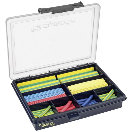 Poliolefin hőre zsugorodó csőkészlet " Colour" . Stabil szortiment dobozban 110 db. Halogénmentes és rugalmas, égésgátló (VW-1/UL244).