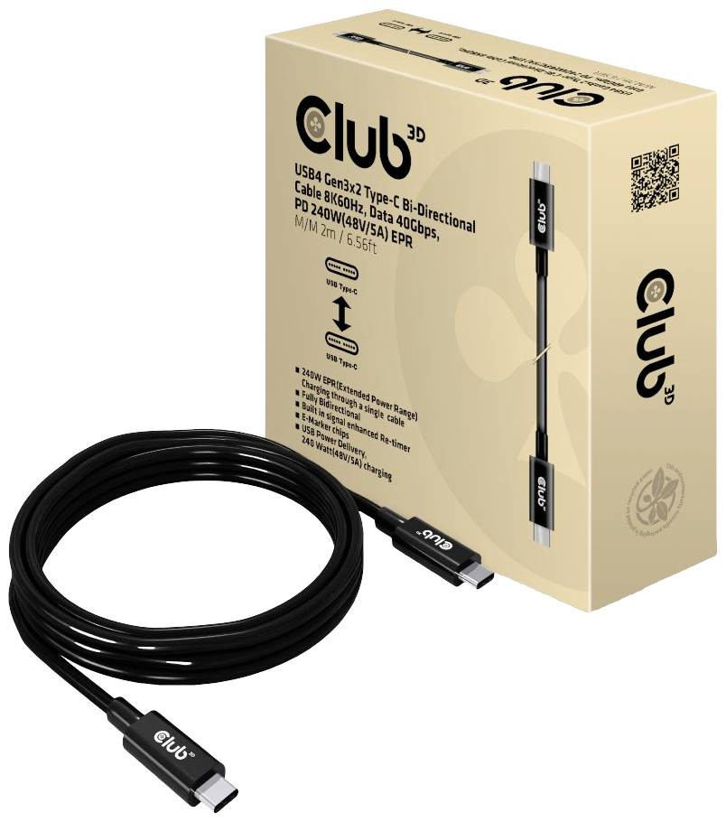 A Club 3D CAC-1578 USB4 Gen3x2 Type-C kétirányú 8K60Hz-es, 40Gbps adatátviteli, PD 240W(48V/5A) EPR St/St 2m kábellel USB4 Type-C kimenettel rendelkező notebookja, táblagépe vagy telefonja csatlakoztatható kedvenc meglévő perifériájához. eszközök, tartozékok és töltők. Lehetővé teszi a videó-, adat- és tápellátást egyetlen kábelen keresztül, mindkét irányban. Ez a kábel támogatja az USB4 Gen3x2 Type-C kétirányú videót 8K60Hz, adatátviteli sebesség 40 Gbps, PD 240W(48V/5A) EPR St/St 2m a notebook, táblagép vagy okostelefon downstream töltéséhez vagy tápellátásához.