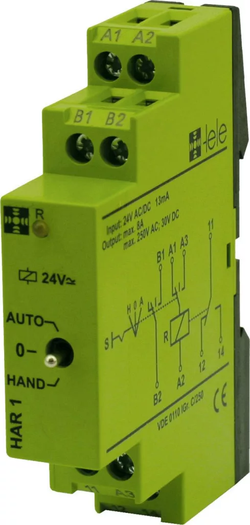Műszaki adatok: Kapcsolási feszültség: 250 V/AC · Kapcsolási teljesítmény: 8 A/2000 VA · Kapcsolóáram: 5 A · Kivitel: Kézi-Automatikus relé · Névleges feszültség: 24 V DC/AC · Típus: HAR1 24 V/AC/DC · Érintkező típus: 1 váltó · Üzemi feszültség: 24 V DC/AC