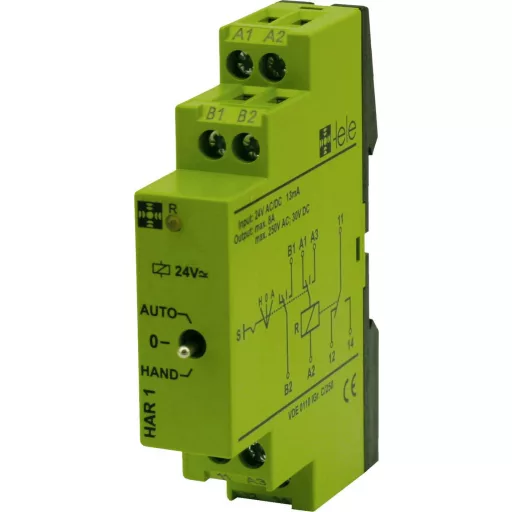 A HAR1 24 V/AC/DC rövid leírása: az üzemmódok a 3-fokozatú kapcsolóval változtathatók · Kéz = tartós "be" · 0 = tartós "ki" Auto = a kimenőrelé kapcsolása külső vezérlőjellel · Az Auto-kapcsolóállás visszajelzése · A reléhelyzet optikai kijelzése.