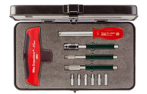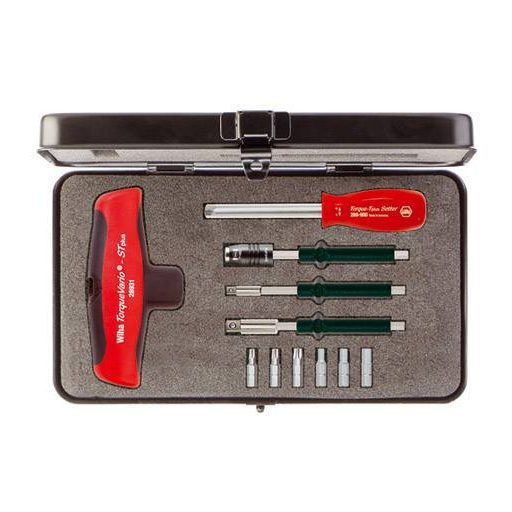 Az 5 Nm feletti meghatározott nyomatékértékű csavarok meghúzásához nagy erőre van szükség egy hagyományos nyomatékcsavarhúzóval. Sokkal könnyebb a TorqueVario®-S Tplus T-nyéles nyomatékcsavarhúzóval. Az integrált numerikus skála és a mellékelt beállító szerszám segítségével a nyomatéktartomány fokozatmentesen állítható, így széles körű alkalmazási lehetőségeket kínál. A nyomaték kioldásakor tisztán hallható és érezhető jelzés biztosítja a folyamatbiztos munkát, és véd az anyagkárosodás és az utólagos megmunkálás ellen. Az integrált csúszókuplung megakadályozza a kívánt nyomatékérték túllépését. A +/- 6%-os kioldási pontossággal a nyomatékszerszám megfelel a DIN EN ISO 6789 szabvány követelményeinek. A kényelmes, puha zónákkal ellátott T-fogantyú optimális nyomatékátvitelt biztosít. A nyomaték T-markolat mellett a készlet tartalmaz 6 mm-es és 1/4 mm-es négyszögletes dugókulcs-adaptereket, egy bittartó adaptert és hat különálló bitet is. Ezenkívül a TorqueVario®-S Tplus kompatibilis a Wiha T-markolatú nyomatékcsavarhúzókhoz való cserélhető pengéivel (2899-es sorozat). A készletben található összes szerszám biztonságosan és rendezetten tárolható egy robusztus és áttekinthető dobozban.