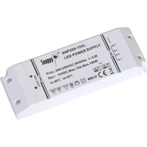 Műszaki adatok: Bemenetek: 1 x · Bemeneti feszültség (max.): 240 V/AC · Bemeneti feszültség (min.): 200 V/AC · Certifikációk: MM SELV TÜV · Csatlakozó (építőelem): Csavaros kapocs · Gyártói szín: Fehér · Hőmérséklet (max.): 45 °C · Hőmérséklet (min.): -20 °C · Kimenetek száma: 1 x · Kimeneti feszültség (max.): 12 V/DC · Kimeneti áram (max.): 15 A · Kivitel (LED meghajtó): Állandó feszültségű · Kivitel (általános): Kapcsolóüzemű tápegység · LED meghajtó jellemzők: Bútorhoz alkalmas · Méret, hossz: 195 mm · Méret, magasság: 35 mm · Méret, szélesség: 65 mm · Súly: 460 g · Teljesítmény (max.): 200 W · Védelmi típus: IP20 · Üzemi áram: 15 A