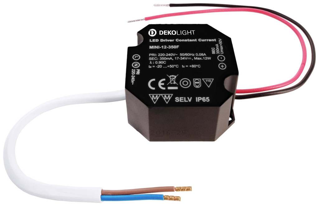 Műszaki adatok: Bemenetek: 1 x · Bemeneti feszültség (max.): 240 V · Bemeneti feszültség (min.): 220 V · Csatlakozó (építőelem): Kábel, nyílt véggel · Gyártói szín: Fekete · Hőmérséklet (max.): 50 °C · Hőmérséklet (min.): -20 °C · Kimenetek száma: 1 x · Kimeneti feszültség (max.): 12 V · Kimeneti feszültség (min.): 6.3 V · Kimeneti áram (max.): 350 mA · Kivitel (LED meghajtó): Állandó áramú · Méret, hossz: 50 mm · Méret, magasság: 24 mm · Méret, szélesség: 48 mm · Teljesítmény (max.): 12 W · Teljesítmény (min.): 6.3 W · Védelmi osztály: II · Védelmi típus: IP65