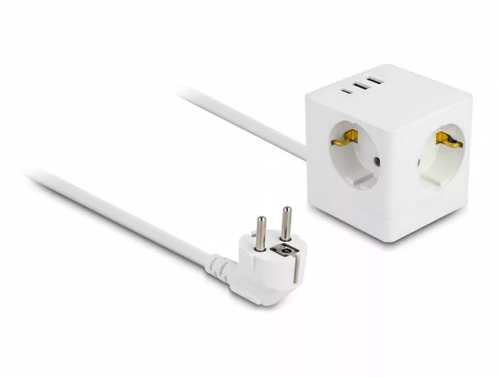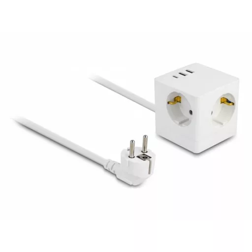 DeLOCK Power Cube 3 utas hosszabbító kábellel, fokozott érintésvédelemmel és USB töltővel, 1,5 m-es kábel, fehér