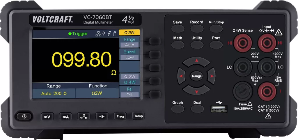 A Voltcraft VC-7060BT egy digitális multiméter tábla formátumban, 4 5/6 számjegytel, amely széles skáláját kínálja a mérési eredmények funkcióinak (statisztikák, határértékek, dB / dBm, REL).