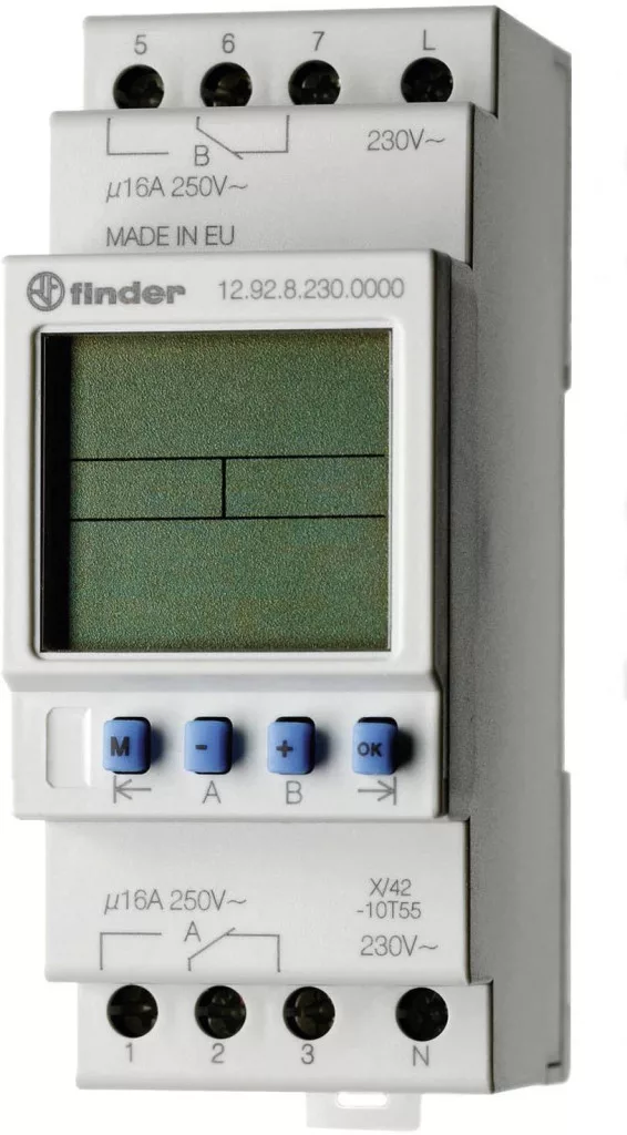 Asztronómiai/elektronikus kapcsolóóra - a 60 kapcsolási idő egyszerű, intuitív programozása tetszés szerint asztronómiai/elektronikus. Asztronómiai idővezérlés: Automatizált kapcsolás, választható napkelte és napnyugta időzónával. Az asztronómiai funkció a napkeltétől és a napnyugtától függetlenül lezárt állapotban lehet (példáula világítás legkésőbb 20:00 órakor kapcsol be). Elektronikus idővezérlés: Automatizált kapcsolás időzítés szerint, automatikus téli/nyári időszámítás váltással. Kézi kapcsolásmegelőzés - folyamatos ki-be kapcsolás kézi kapcsolóval. Hálózati csatlakoztatás nélkül programozható. Helymeghatározás a legközelebbi város kiválasztásával, vagy a koordináták megadásával, valamint egyéb hasznos funkciók. Program biztonsági mentés PIN kódolással. 35 mm-es DIN sín részére.