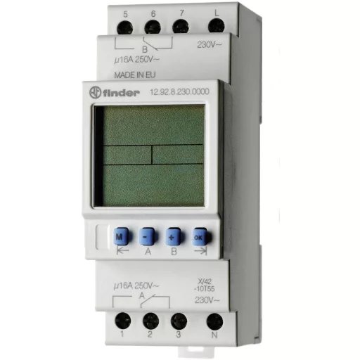 Műszaki adatok: Időtartomány: 60 programhely, a legrövidebb kapcsolási távolság 1 perc · Kapcsolási feszültség: 250 V/AC · Kapcsolási teljesítmény: (AC1) 4000 VA · Kapcsolóáram: 16 A · Kivitel: Napi program · Kontakt terhelhetőség: (230 V esetén): izzólámpák: 2000 W, kompenzált fénycsövek: 420 W, nem kompenzált fénycsövek: 1000 W, halogénlámpák: 2000 W · Környezeti hőmérséklet: -30 - + 55 °C · Méret, szélesség: 35.8 mm · További műszaki adatok: Áramszüneti működőképesség 6 év · Típus: 12.92.8.230.0000 · Védelmi típus: IP20 · Érintkező típus: 2 váltó · Érintkezőanyag: AgSnO