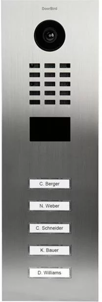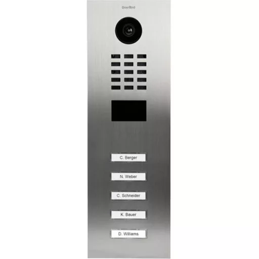 Műszaki adatok: Anyag (kültéri egység): Nemesacél V2A · Bővíthető: Beltéri egység, Kültéri egység · Felhasználási terület (Smart Home): Biztonság · Gyártói szín: nemesacél V2A (kefélt) · Hangrendszer összetevők: Külső egység · Kameratípus: HDTV 720p dinamikus (VGA-HDTV) · Kaputelefon jellemzők: Világító névtábla, Képtárolóval · Látószög, függőleges: 100 ° · Látószög, vízszintes (max.): 140 ° · Szerelési mód (kívül): Falra szerelhető, Süllyeszett · Szám (egységek/résztvevők): 5 · Tápellátás: Hálózatról üzemeltetett (PoE), Kalapsín tápegységről üzemeltetett, Hálózati adapterről üzemeltetett · Átviteli mód: LAN