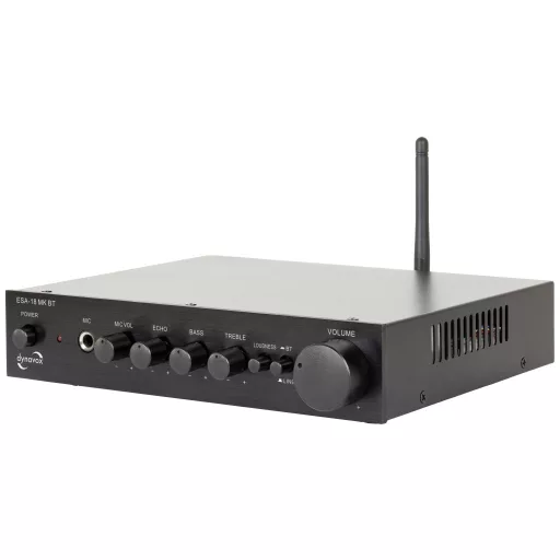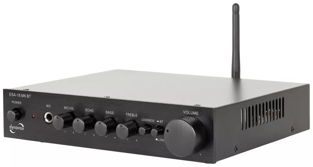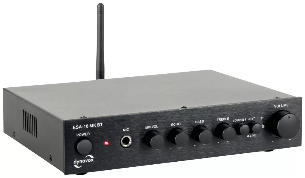 A Dynavox ESA-18 MK BT az E-SA18 sztereó mini erősítő utódja, amely évek óta sikeres. A készülék az elődjéhez képest teljesen átdolgozott fémházzal, masszív 4 mm-es előlappal, némileg eltérő méretekkel és BT vétellel rendelkezik. A Dynavox ESA-18 MK BT 2 vonal bemenettel és egy mikrofon bemenettel rendelkezik. A mikrofon bemenet hangereje és visszhangja állítható. Kapcsolható hangerő, felvétel, különálló magas- és mélyhangszabályzók, valamint egy kikapcsolható automatikus készenléti vezérlő (a készülék jelkimenet nélkül kb. 30 perc után automatikusan kikapcsol) teszi teljessé a kiterjedt felszereltséget.