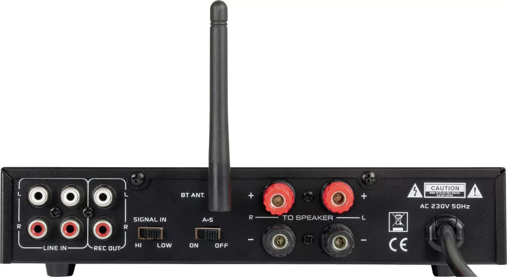 Jellemzők: Csatlakozások: 2 x vonal bemenet (RCA / cinch), 1 x mikrofon 6,3 mm-es jack · Kimenetek: 1 x REC cinch sztereó, 1 x BT (V 5.0) Teljesítmény: 2 x 75W zene Frekvenciaválasz: 20Hz-20kHz (+/- 3dB) · Jel-zaj arány: 88 dB Hálózati feszültség: 230 V / 50 Hz · Méretek: kb 220 x 50 x 230 mm · Súly: kb. 2,1 kg · Bemeneti érzékenység (RCA bemenet): 150 mV / 300 mV (SIGNAL IN kapcsolható magas/alacsony