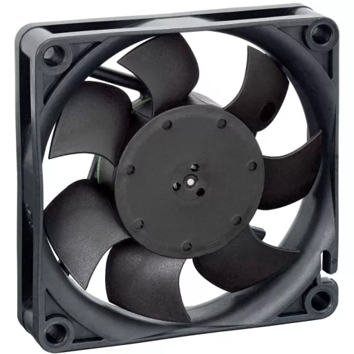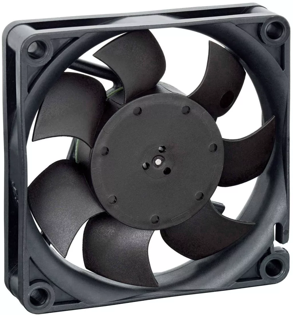 Műszaki adatok: Anyag: Műanyag · Csapágytípus: Csúszócsapágy · Fordulatszám: 5300 fordulat/perc · Gyártói szín: Fekete · Hőmérséklet (max.): 70 °C · Hőmérséklet (min.): -20 °C · Légáramoltatás: 43 m³/óra · Méret, hossz: 70 mm · Méret, magasság: 15 mm · Méret, szélesség: 70 mm · Névleges feszültség: 24 V/DC · Teljesítmény: 1.5 W · Zajkibocsátás (max.): 38 dB · Áramfelvét (max.): 64 mA