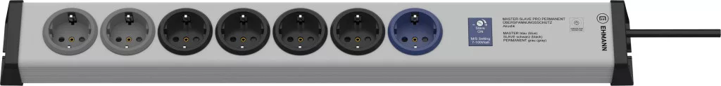 A robusztus műanyag szalagok stabil véglapokat kínálnak, mindkét oldalon rögzíthetők. Ez lehetővé teszi a mobil használatot, valamint a falhoz és a padlóhoz történő egyszerű rögzítést is. A 7-100W állítható kapcsolási küszöb pontosan hozzáigazítható a csatlakoztatott fő eszközhöz (fő eszköz). A fekete rabszolga-aljzatokban található összes eszköz automatikusan be- és kikapcsol. Ezenkívül a két szürke edény állandóan működtethető. A csatlakoztatott eszközök csatlakoztatása pl. B. A villámcsapások elleni védelem érdekében a tápcsík túlfeszültség-védelemmel rendelkezik az EN 61643-11 Type3 szerint.
