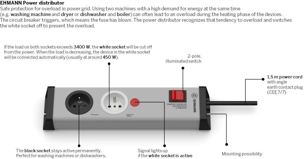 A meglévő házbeépítést nem mindig számos elektromos készülék energiaigényére tervezték. Ha például egy szárítógépet, a mosógépet vagy a kazánt és a mosogatógépet egy áramkörhöz csatlakoztatják, akkor túlterhelés léphet fel, ha mindkét készüléket egyszerre hevítik. A speciális áramelosztó megakadályozza a biztosíték kioldását vagy a vezeték tüzet, mivel a fogyasztót az energiától függően kikapcsolja (3400W). Amint az energiafogyasztás csökken, a második fogyasztó automatikusan újra bekapcsol.