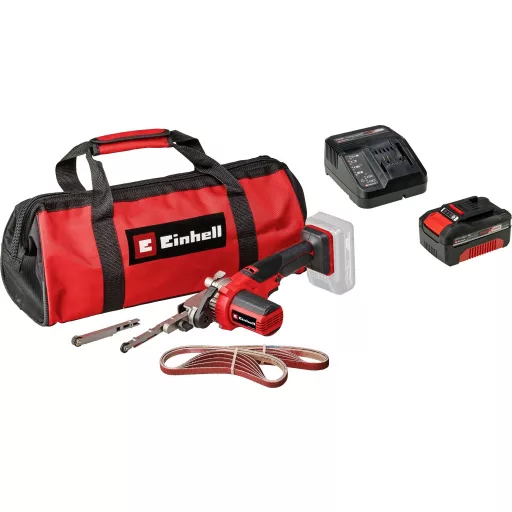 A készlet tartalma: Einhell Power X-Change TE-BF 18 Li-solo akkus szalagcsiszoló és PXC 18V 4 Ah kezdőkészlet