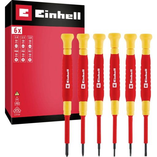 Az Einhell 6 darabos villanyszerelő precíziós csavarhúzókészlete ideális elektronikus alkatrészeken, vezérlőkön, sorkapcsokon és kisebb készülékeken végzett precíz munkákhoz. Három darab 2 / 2,5 / 3 mm méretű hornyos csavarhúzót és három PH00 / PH0 / PH1 méretű csillagcsavarhúzót tartalmaz, mindegyik 50 mm-es pengével. A csavarhúzók DIN EN IEC 60900 szabvány szerint szigeteltek, és akár 1000 voltos feszültségig is alkalmasak, ami maximális biztonságot nyújt az elektromos szerelésekben. A fekete hegyű, robusztus S2 pengék biztos fogást biztosítanak és megakadályozzák a csavarfejben való elcsúszást. Az ergonomikus, kétkomponensű, piros és sárga markolatok kényelmes munkavégzést és optimális erőátvitelt biztosítanak alakjuknak és csúszásmentes felületüknek köszönhetően. A nyél végén található forgó sapka megkönnyíti a kis csavarok precíz becsavarását, mivel stabilizálja a kéz helyzetét és optimalizálja az ujjvezetést. Kompakt kialakításának és rövid pengéinek köszönhetően a készlet nehezen elérhető munkaterületeken is használható. Ezáltal a precíziós csavarhúzókészlet ideális alapkészletté válik az elektromos szektorban végzett telepítésekhez, javításokhoz és karbantartáshoz.