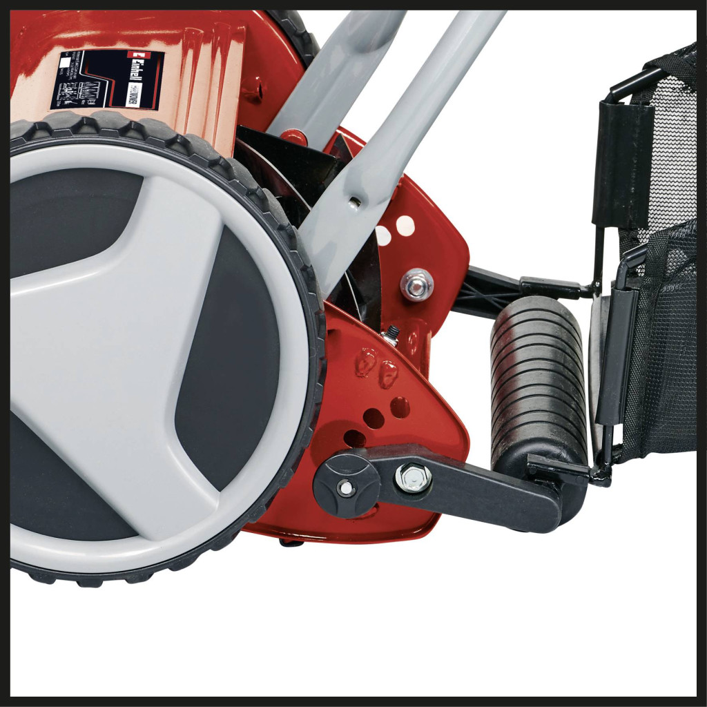 Az Einhell GC-HM 300 kézi fűnyíró egy robusztus, funkcionális motorhajtás nélküli fűnyíró, amellyel akár 150 m²-es pázsit is tisztán, csendesen és környezetbarát módon nyírható. A golyóscsapágyas kaszaorsó 5 kiváló minőségű acél pengével van felszerelve, 30 cm-es vágásszélességhez. A 4 fokozatú vágási magasság beállítás 13 mm és 37 mm között egyénileg állítható. A műanyag henger átmérője 45 mm. A kézi fűnyíró gyepbarát, nagy kerekekkel van felszerelve. Az ívelt kormány optimális ergonómiát biztosít a munkavégzés során, a parkolási helyzet pedig lehetővé teszi a fűnyíró biztonságos és egyszerű tárolását. A 16 literes fűgyűjtő doboz kivehető és könnyen üríthető.