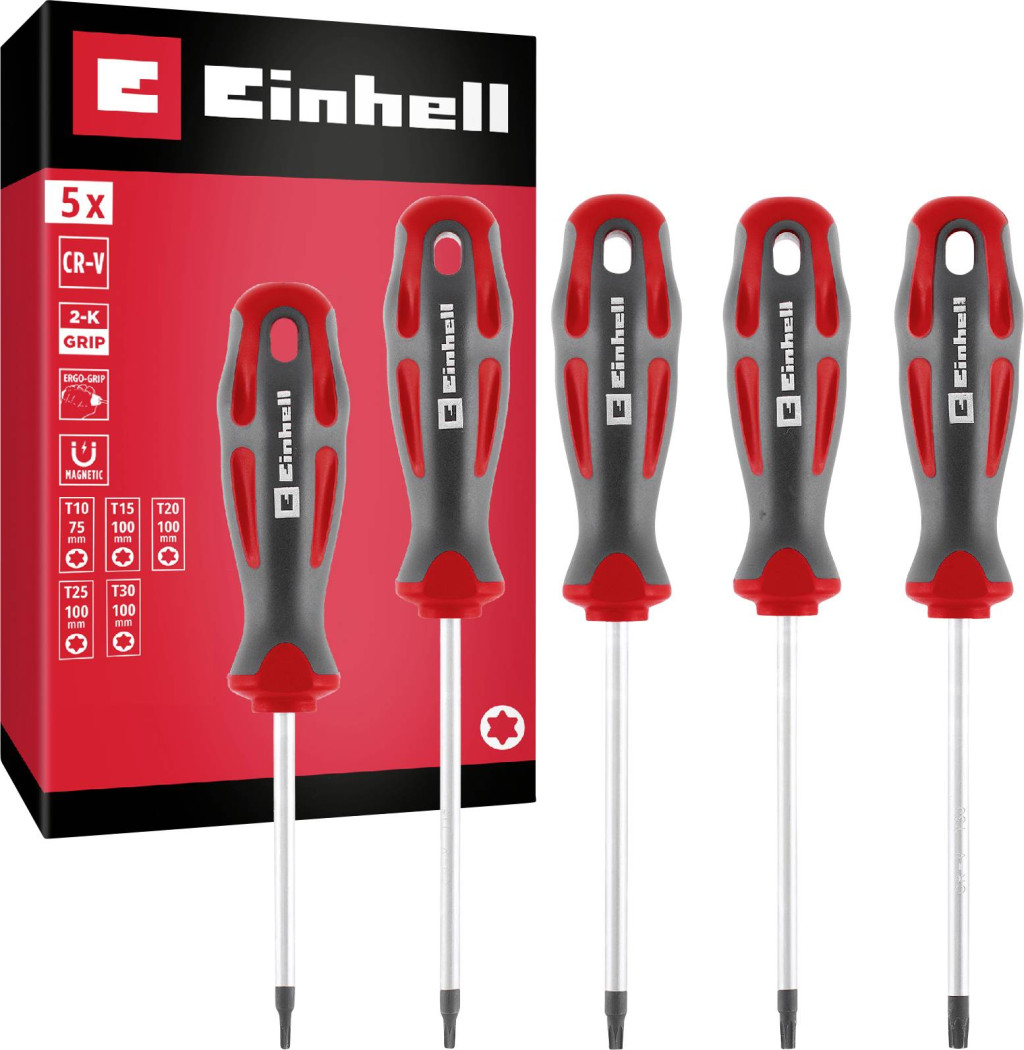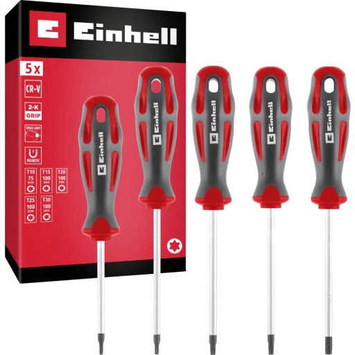 Eredeti Einhell csavarhúzókészlet, 5 részes, T-profil (CrV pengék, mágneses hegy, T10/T15/T20/T25/T30 profilméretek, ergonomikus fogantyúk, furatos fogantyúk)