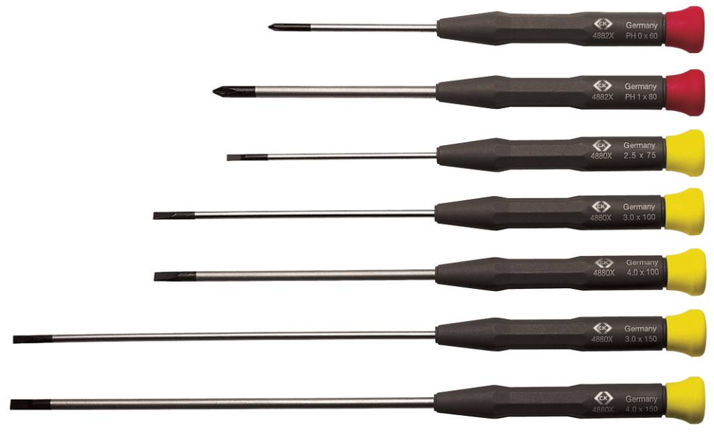 Műszaki adatok: Alkalmazás: Elektronika- és finommechanika · Anyag: Króm-vanádium-molibdén acél · Anyagjellemző: Krómozott,Barnított · Csavarhúzó típus: Csavarhúzó készlet · Elhajtás: Egyeneshornyú,Kereszthornyú Phillips