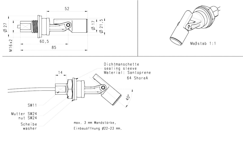 Kompakt úszókapcsoló oldalsó beszereléshez, kívülről, tömítő karmantyúval. Ellenálló az enyhe szervetlen savakkal és lúgokkal, az alkohollal, illetve olajokkal szemben. A záró- illetve nyitófunkció 180 °-os forgatással szabadon választható.