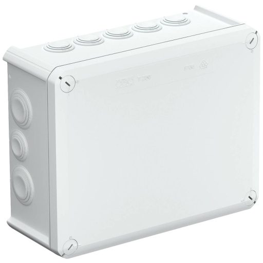 A T-sorozat kábelcsatlakozó dobozai UV-állóak. Ezek egy hőre lágyuló polipropilénből állnak, amelyek etilén-vinil-acetát EVA-ból készült dugaszolható tömítésekkel vannak ellátva. Így a csöveket a 9x M25 + 7x M32 tömítéseken keresztül lehet szerelni, vagy a tömítéseket késsel vágják a kijelölt helyeken, hogy a csövek belépési nyílása legyen. Alternatív megoldásként a nyílásokon keresztül a tömítések helyett kábelbevezetőket lehet behelyezni, és belülről reteszzárral ellensúlyozni lehet. A kábelcsatlakozó dobozok a padlón lévő nyílásokon 3,5 x 9,5-es fémlemezes csavarokkal szerelhetők fel. Belső méretek: 225 x 173 x 86 mm. Fedje le a címkézési mezőt és zárja le.