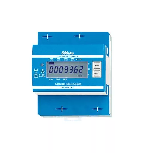 A német kalibrálási törvény 25. szakasza szerint csak kalibrált fogyasztásmérők engedélyezettek a villanyszámlázáshoz. A kötelezettségszegés a 19. § szerinti közigazgatási szabálysértésnek minősül. RS485 busz kétirányú háromfázisú mérő. Maximális áramerősség 3x80A, készenléti veszteség csak 0,8 watt az L1-nél és 0,5W az L2-nél és L3-nál. Moduláris szerelőeszköz DIN-EN 60715 TH35 szerelősínre szereléshez IP51 védelmi osztályú szerelőszekrényekben. 4 osztású egység = 70 mm széles, 58 mm mély. B pontossági osztály (1%). RS485 interfésszel. A közvetlenül mérő háromfázisú mérő az aktív energiát a bemenetek és kimenetek között folyó áramok alapján méri. Az útvonalonként mindössze 0,8 watt vagy 0,5 W aktív teljesítmény önfogyasztása nem mérhető és nem jelenik meg. Az aktív energia a jeltől függően hozzáadódik. A mérő pozitív teljesítménye energiafogyasztást, a negatív teljesítmény energiaszállítást jelent. Az energiamérés kiegyensúlyozott. Ha az energiafogyasztás (P pozitív) nagyobb, mint az energiaellátás (P negatív), a mérő jobbra mutató T nyíl értéke megnő. Ha az energiaellátás nagyobb, mint az energiafogyasztás, a mérőóra állása T balra nyíl megnő. Az energiafogyasztást egy jobbra mutató nyíl, az energiaellátást pedig egy balra mutató nyíl jelzi a kijelzőn az aktív sáv felett. 1, 2 vagy 3 fázisú vezetékek csatlakoztathatók akár 80A áramerősségig. Az indítóáram 4OmA. Az L1 és N csatlakozásoknak rendelkezésre kell állniuk. Csatlakozás FBA14-en keresztül az Eltako RS485 buszhoz 2 magos árnyékolt buszvonallal (pl. telefonvonal). A mérőállás és a pillanatnyi kimenet átkerül a buszra – például egy külső számítógépre vagy a GFVS 4.0 szoftverre – és a FAM14-en keresztül a rádióhálózatba is. Ehhez a FAM14 vezeték nélküli antennamodulnak hozzá kell rendelnie egy eszközcímet a kezelési útmutatóban leírtak szerint. A 7 szegmenses LC-kijelző két héten belül akár tápellátás nélkül is kétszer olvasható. Az energiafogyasztást a kijelző melletti LED jelzi, amely kWh-nként 1000-szer felvillan. A kijelző jobb oldalán találhatók a MODE és a SELECT gombok, amelyek a menüben való görgetésre szolgálnak a kezelési útmutatónak megfelelően. Először a háttérvilágítás bekapcsol. Ekkor megjeleníthető a teljes aktív energia importonként és szállításonként, az újraindítható memória import és szállítás aktív energiája, valamint az egyes fázisvezetők pillanatnyi teljesítménye, feszültsége és áramértékei. Hibaüzenet (hamis): Ha a külső vezeték hiányzik, false és a megfelelő külső vezeték jelenik meg a kijelzőn.
