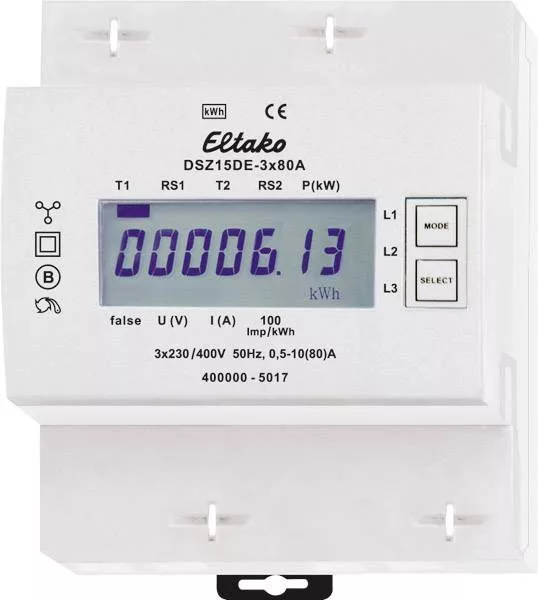 A maximális áram 3x80A, készenléti veszteség csak 0,5 watt per út. Moduláris eszköz a DIN-EN 60715 TH35 szerelősínre történő felszereléshez. 4 modul = 70 mm széles, 58 mm mély. B pontossági osztály (1%). S0 interfésszel. A háromfázisú közvetlen mérésű mérőkészülék az aktív energiát a bemenetek és a kimenetek közötti áramlások alapján méri. Az útvonalonként csak a 0,5W aktív teljesítmény belső fogyasztását nem mérik, és nem jelenítik meg. 1, 2 vagy 3 külső vezetéket csatlakoztathatunk 80A-ig terjedő árammal. A kezdő áram 4OmA. Az N kapcsolatnak jelen kell lennie. A 7 szegmenses LC kijelző két héten belül kétszer olvasható, még tápegység nélkül is. Az energiafogyasztást egy oszlop jelzi, amely a kijelzőn kWh-on 100-szor villog. Alapkivitelben 2-vámtarifaszámlálóként is használható: Ha az E1 / E2 terminálokra 230 V feszültséget alkalmaznak, a rendszer második tarifára vált. A kijelző jobb oldalán található a MODE és a SELECT gombok, amelyek a kezelési útmutatónak megfelelően gördítik a menüt. Először bekapcsol a háttérvilágítás. Ezután megjeleníthető a tarifánkénti teljes aktív energia, az RS1 vagy RS2 visszaállítható memória aktív energiája, valamint a külső vezetőnkénti teljesítmény, feszültség és áram pillanatnyi értékei. Hibaüzenet (hamis): Ha hiányzik a külső vezető vagy ha az aktuális irány nem megfelelő, akkor a hamis és a megfelelő külső vezető megjelenik a kijelzőn.