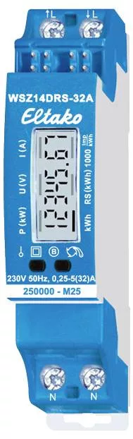 Maximális áramerősség 32A, készenléti veszteség csak 0,4 watt. Moduláris szerkezet DIN-EN 60715 TH35 sínre szereléshez. 1 osztóegység = 18 mm széles, 58 mm mély. Csatlakozás az ELTAKO RS485 buszhoz. Keresztvezetékes busz és tápegység jumperrel. A mérőállás, a pillanatnyi teljesítmény és a sorozatszám átkerül a buszra – pl. külső számítógépre, vezérlőre történő továbbításhoz – és a FAM14-en keresztül a rádióhálózatba is elküldhető. Ehhez a FAM14 rádióantenna modulhoz készülékcímet kell rendelni a kezelési útmutatóban leírtak szerint. Ez az AC mérő aktív energiát mér a bemenet és a kimenet között folyó áram alapján. A legfeljebb 0,4 watt aktív teljesítmény önfogyasztása nem mérhető és nem jelenik meg. Egy legfeljebb 32A áramerősségű külső vezeték csatlakoztatható. Az indítóáram 20mA. B pontossági osztály (1%). Ha a várható terhelés meghaladja az 50%-ot, akkor a szomszédos berendezésektől 1/2 osztóegység szellőzési távolságot kell tartani. A szállítási terjedelem 2 db DS14 távtartót és a rövid jumperen kívül további két hosszú jumpert tartalmaz. Két N kapocs több mérő biztonságos keresztbekötéséhez. A fogyasztást a rendszer nem illékonyan tárolja, és áramkimaradás után azonnal újra megjelenik. A 7 szegmenses LC-kijelző két héten belül akár tápellátás nélkül is kétszer olvasható. Ehhez nyomja meg a gombot. A kijelző alatt található egy gomb, amellyel a kezelési útmutató szerint görgethető a menü. Először a háttérvilágítás bekapcsol. Ekkor a teljes aktív energia, a visszaállítható memória aktív energiája, valamint az aktív teljesítmény, a feszültség, az áram és a PcH érték pillanatnyi értékei jeleníthetők meg. Az energiafogyasztást egy kWh-nként 1000-szer felvillanó sáv és egy kWh-nként 2000-szer felvillanó piros LED jelzi. Hibaüzenet: Csatlakozási hiba esetén a kijelző háttérvilágítása villog. Speciális mérő üzemmódok: A FAM14 mérő üzemmódjaiban a hangsúly a villanyóra adatok állítható átviteli sebességén van a külső épületenergetikai menedzserek számára. Az adatok lekérhetők és továbbíthatók a FAM14 (FGW14, FGW14-USB, FGW14W(L)-IP) csatlakoztatott átjáróin keresztül. A 33/23. héttől gyártott mérőkhöz további beállítási lehetőségek állnak rendelkezésre a FAM14-en.