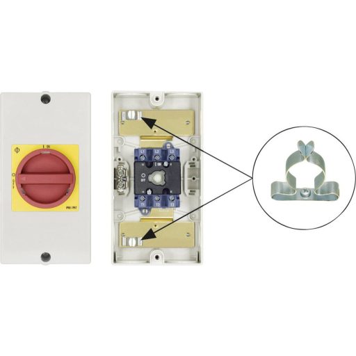 Műszaki adatok: Alkalmas: Csavarozás M20 · Csatlakozó: Csavaros csatlakozó · Felirat/motívum: 0/1 · Funkciók (kapcsoló/nyomógomb): Reteszelő · Gyártói szám: KG10 T203/D-A076 KS51V · Ház/gomb szín: Piros,Sárga · Kapcsolási szög: 1 x 90 ° · Kapcsoló/nyomógomb jellemzők: lezárható · Kivitel: 0 állásban lezárható · Menet: M20 · Méret, magasság: 120 mm · Méret, mélység: 90 mm · Méret, szélesség: 85 mm · Működtetés: Vészkikapcsoló · Pólusszám: 3 · Tartalom: 1 db · Teljesítmény: 5.5 kW · Típus: Javítás kapcsoló · Védelmi típus: IP66/IP67 · Érintkező típus: 1 záró,1 nyitó
