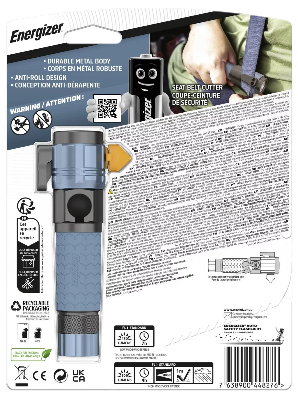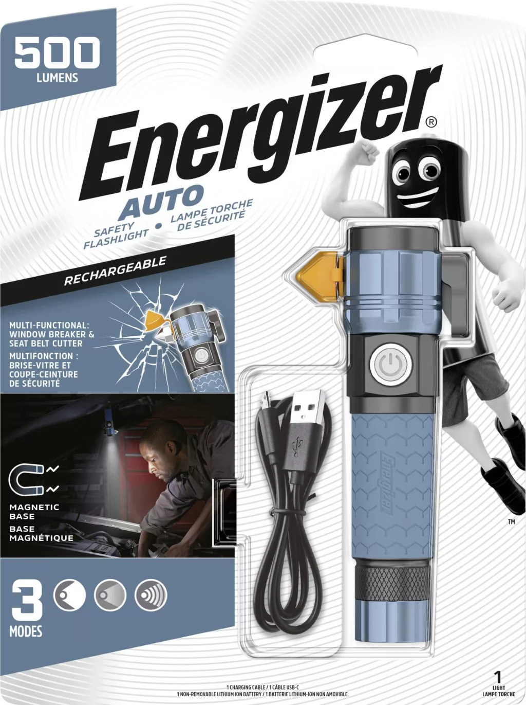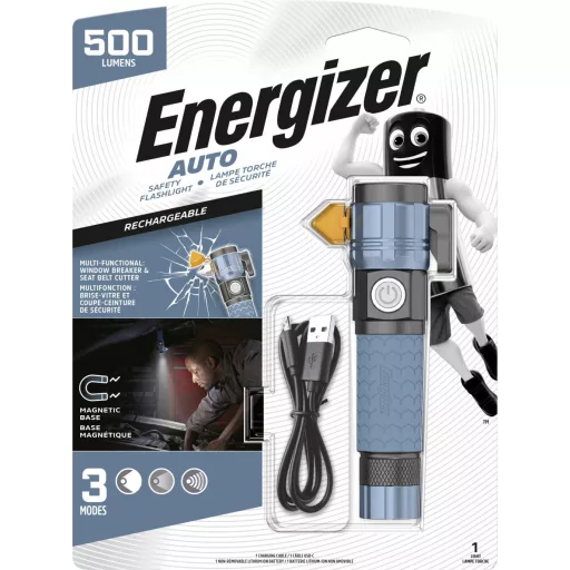 Az Energizer újratölthető autós fém zseblámpával jól felkészült egy autóbalesetre. Erős LED lámpával, biztonsági övvágóval és üvegtörővel rendelkezik. Az 500 lumen fényerejű LED lámpa akár 12-szer fényesebb, mint a hagyományos LED technológia, és akár 7 órán keresztül világít alacsony üzemmódban. A magas, alacsony és villogó üzemmóddal ez a nagy teljesítményű zseblámpa mindenben segítségére lehet, az út szélén lévő autójavítástól a sötétedés utáni segélyszolgálatokig. Az újratölthető hibrid lítium-ion akkumulátor mindössze 4,5 óra alatt töltődik fel egy mikro-USB töltőkábellel, és az autós töltő segítségével útközben is táplálható. Szabad kezet akarsz? A zseblámpa mágneses talpa a felületekhez tapad, így lámpaként is funkcionálhat. Dönthető, hogy közvetlen fényt biztosítson ott, ahol szüksége van rá – akár gumiabroncsot kell cserélnie, bele kell néznie a motorba, vagy javítani kell.