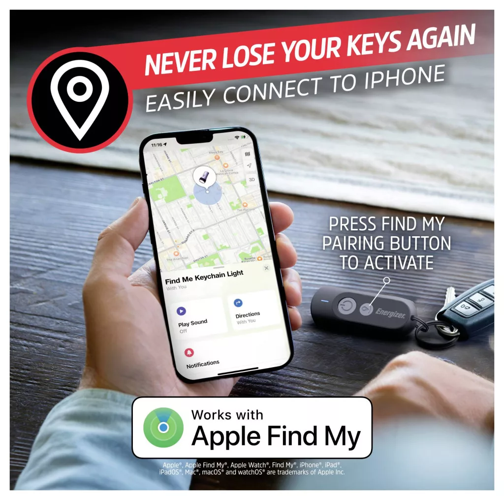 Az Energizer Find Me kulcstartó lámpa erős LED-es fénnyel és integrált Apple " Find My" technológiával megkönnyíti a kulcsok megtalálását. A beállítás az Apple „Find My” alkalmazásban hihetetlenül egyszerű, és mindössze néhány lépésben csatlakoztatja a kulcstartó lámpáját az iPhone-jához – az azonnali kulcskeresés érdekében.