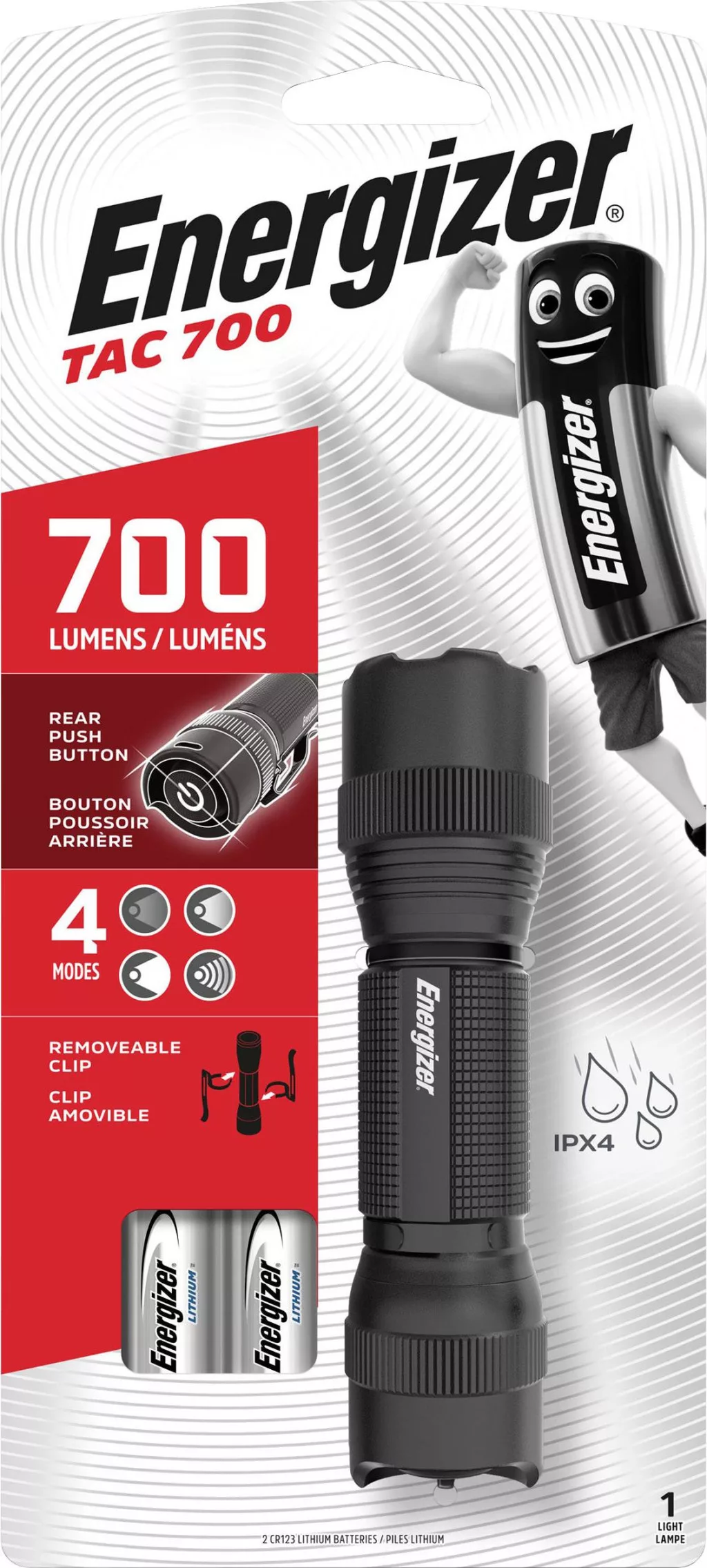 Alkalmas kempingezéshez, áramszünethez vagy más vészhelyzethez, akár 700 lumen fényerővel is számolhat (HIGH módban), hogy megvilágítsa az utat. A strapabíró zseblámpával akár 100 méteres fényerőt is vetíthet (HIGH módban), valamint villogó fényt vészhelyzet esetén. Nem kell spórolni ezzel a lámpával – strapabíró repülőgép-alumíniumból készült, feltűnő kerettel rendelkezik, és vízálló. Az Energizer Tactical LED zseblámpával minden helyzetre felkészült.
