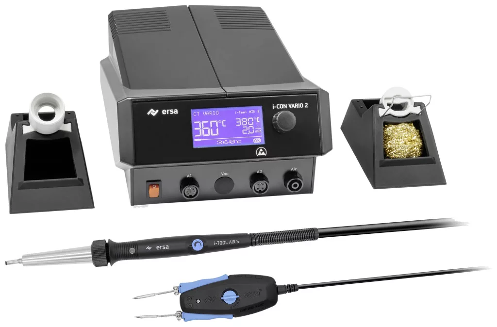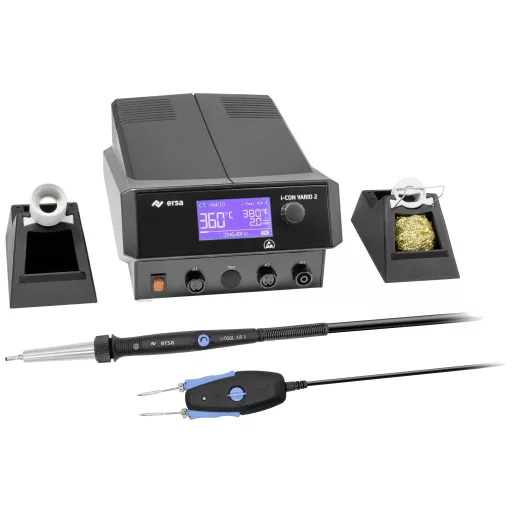 Az i-CON VARIO 2 MK2 többcsatornás forrasztó- és kiforrasztóállomás két, egyidejűleg használható forrasztószerszámot biztosít a professzionális forrasztófelhasználónak. Az új, ergonomikus i-TOOL AIR S (200 W) forrólevegős vasalóval párhuzamosan a 150 W-os erős i-TOOL egy újabb forrasztószerszámként használható a klasszikus forrasztáshoz, vagy az új kiforrasztó csipeszhez, a CHIP TOOL VARIO (80 W-hoz). Alternatív megoldásként más Ersa forrasztószerszámok is használhatók. A kompakt, ESD-biztos tápegység az i-CON-MK2 családban megszokott módon a megszokott egyszerű és áttekinthető kezelhetőséget kínálja. A nagyobb i-CON VARIO 4 MK2-höz hasonlóan az Ersa forrasztófüst elszívó és előmelegítő lapjaihoz való interfészek ugyanolyan természetesek, mint az állomás egyszerű és biztonságos konfigurációja microSD memóriakártyán keresztül.