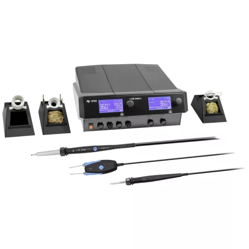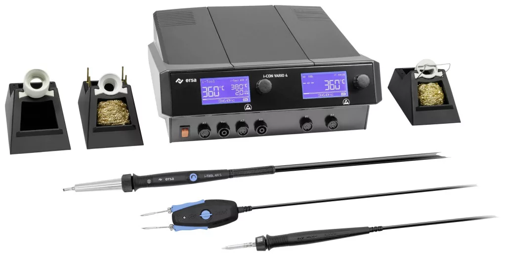 Az i-CON VARIO 4 MK2 többcsatornás forrasztó- és kiforrasztóállomás megfelel a professzionális forrasztás és kiforrasztás legmagasabb követelményeinek. Az i-CON család zászlóshajója négy forrasztószerszámot biztosít a felhasználónak az igényes forrasztási feladatokhoz: Rugalmas forrasztás és kiforrasztás érintésmentes energiaátvitellel az új, ergonomikus forrólevegős vasalóval i-TOOL AIR S (200 W), hatékony forrasztás a 150 W-os nagy teljesítményű i-TOOL MK2, a legfinomabb SMD elemek precíz kiforrasztása az új CHIP TOOL VARIO (80 W) kiforrasztó csipesszel, és a vezetékes alkatrészek kiforrasztása a bevált X-TOOL (120 W) segítségével. Alternatív megoldásként más Ersa forrasztószerszámok is csatlakoztathatók. Minden funkció, beleértve a levegő- és vákuumgenerálást is, egy központi ellátó egységben található, a szokásos egyszerű i-Op kezeléssel és tiszta kijelzőkkel. Az állomás interfészeket is kínál az Ersa forrasztófüst elszívó rendszerekhez vagy infravörös előmelegítőkhöz, valamint USB portot. Az állomás gyorsan és biztonságosan konfigurálható microSD memóriakártya használatával, ezért ideálisan fel van szerelve a professzionális elektronikai gyártás minden alkalmazási területére. Az állomás ideális az ESD védelmi zónákban való használatra.