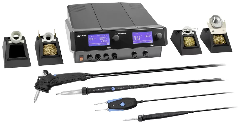 Többcsatornás forrasztó és kiforrasztó állomás, antisztatikus i-TOOL AIR S forrólevegős vasalóval, CHIP TOOL VARIO kiforrasztó csipeszekkel, i-TOOL MK2 forrasztópákával és X-TOOL Vario kiforrasztópákával.