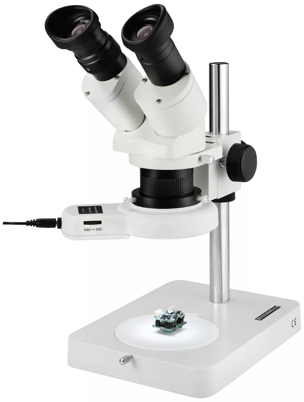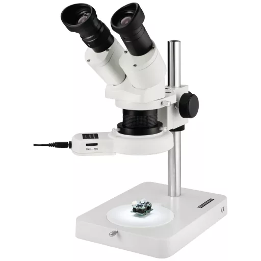 Az állvánnyal rendelkező Eschenbach sztereomikroszkóp binokuláris 45°-os ferde kilátással rendelkezik. A 33213 LED gyűrűs világítása szabályozható. A sztereó mikroszkóp 10-20-szoros optikai nagyítással rendelkezik. A munkatávolság 79-82 mm, a pupilla távolsága pedig 54-74 mm.
