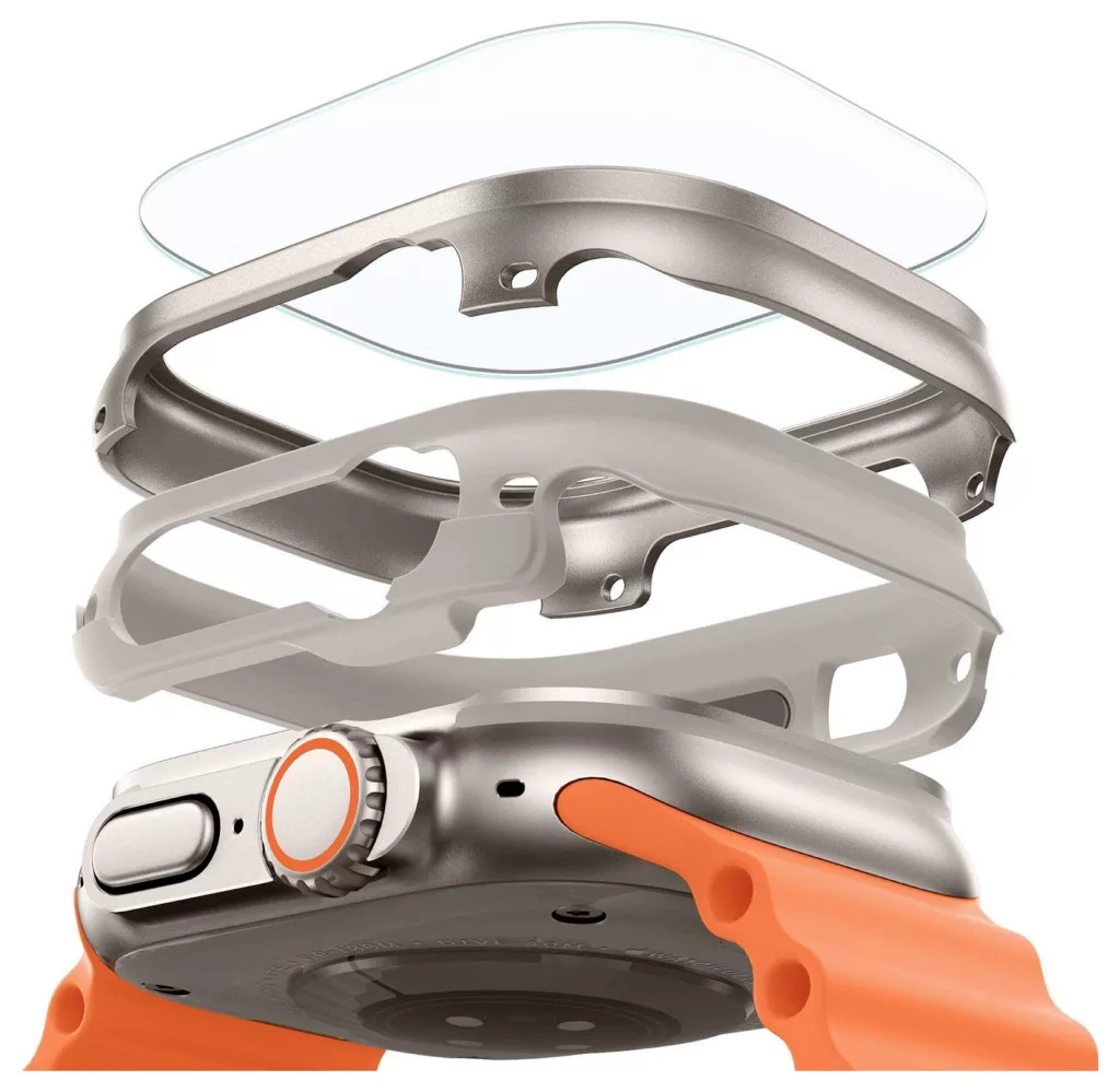 A kétrészes tok (alumíniumötvözetből és TPU belső bélésből áll) teljes védelmet nyújt az Apple Watch Ultra okosórádnak.