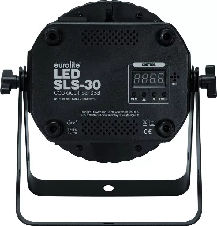 Jellemzők: 1 nagy teljesítményű 30 W-os RGBW LED (4in1) auto, zene, master / slave és DMX módban integrált show-programok automatikus és zenei módban közvetlen színválasztás 18 színfokozat nélküli RGBW színkeveréshez, színváltoztatáshoz, színkeveréshez, dimmerhez és stroboszkóphoz - Hatás a címzésre és a beállításokra a vezérlőegység segítségével, 4 számjegyű LED-kijelzővel. Kényelmes távirányító a mellékelt infravörös távirányítón keresztül. EUROLITE IR-7 Zenevezérlés beépített mikrofonon keresztül állítható mikrofon érzékenységgel, 3, 4, 5, 6 vagy 9 DMX csatornával választható DMX és hálózati csatlakozással optimalizálva az egyszerű huzalozáshoz Kompatibilis a QuickDMX-vel - az Eurolite Phantom tápellátással ellátott rádió-DMX rendszere a QuickDMX vevőkészülékhez (tartozék) Forgatható tartókeret Kiegészítő tartó a padlóra történő felszereléshez IEC hálózati csatlakozók akár 8 készülék egyszerű csatlakoztatásához LED: mosási hatás 1 x COB (chip-on-board) 30 W 4in1 QCL RGBW (homogén színkeverék) Vezérlés: IR távirányító DMX QuickDMX USB-n keresztül (opcionális) Önálló vetület: nem villog
