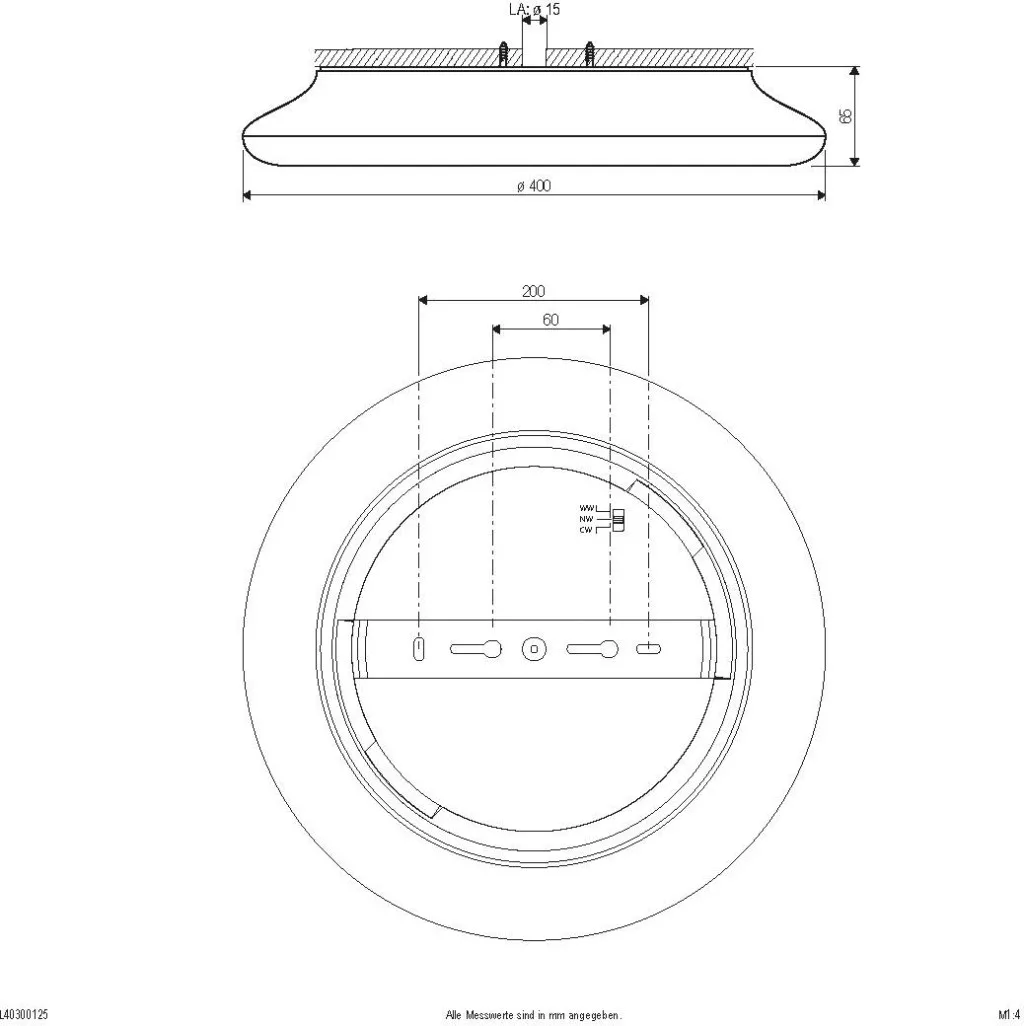 Műszaki adatok: 2021-es energiahatékonysági osztályok: n.rel. · Anyag: Műanyag · Fényforrással: Igen · Fényszín: 5700 K · Fényszín (fényforrás): Melegfehértől nappalifény fehérig · Fényáram összesen: 3160 lm · Gyártói szín: Fehér · Lámpa jellemzők: Falra szerelhető · Méret, magasság: 65 mm · Teljesítmény: 30 W · Védelmi osztály: II · Védelmi típus: IP54, IK06 · Átmérő: 400 mm · Üzemi feszültség: 200 V, 240 V