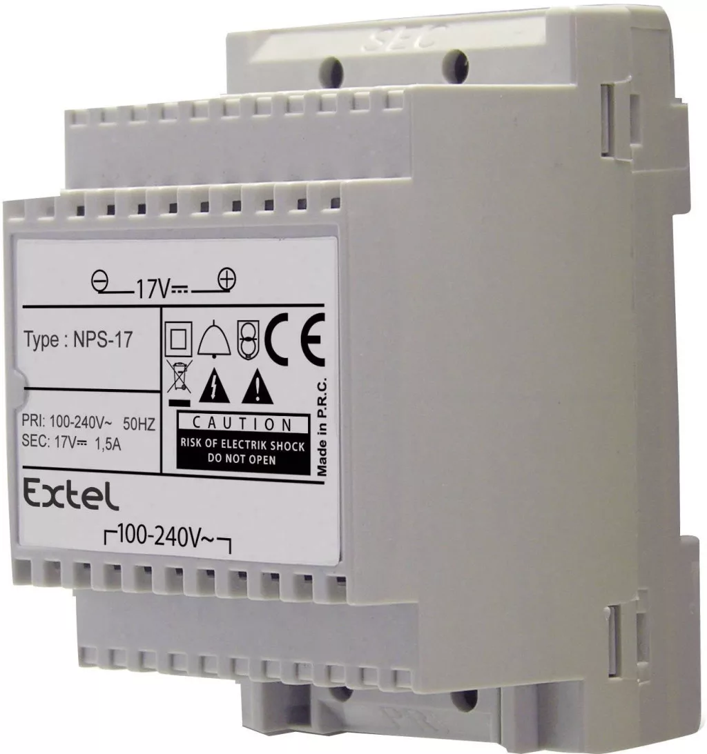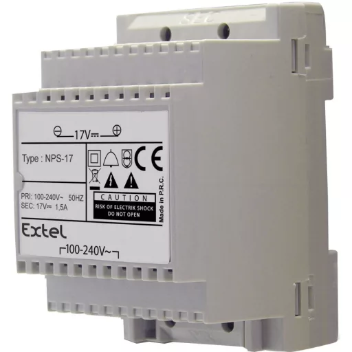 Az EXTEL rendszerekhez (Luka, Mika, Bordy) megfelelő felső kalapú sín tápegység kicseréli a mellékelt csatlakozó modult VAGY az összes többi EXTEL rendszer helyett egy 17 voltos felső kalapú sín transzformátorral. Elektronikus védőberendezéssel, így nem kell biztosítékot cserélni.