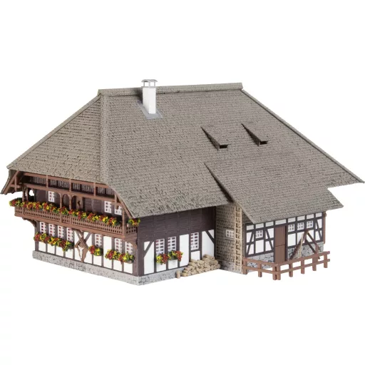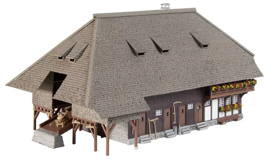 A nagy, kétszintes Fekete-erdei farm hagyományos favázas szerkezetével és kontyolt tetőjével némi Fekete-erdő bájt visz a miniatűr elrendezésbe. Számos hozzá illő kiegészítő található a csomagban, többek között egy trágyakocsi virágvályúként, kaszák, létrák és más szép díszítőelemek, amelyek tökéletesen kiegészítik a modellt.