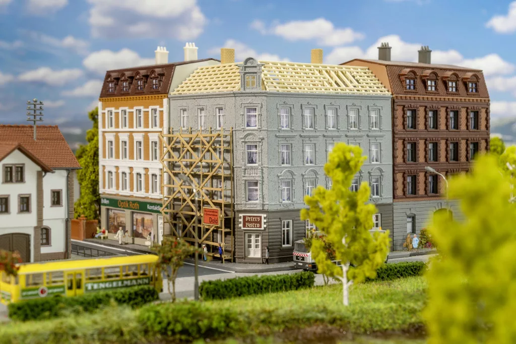Ez a felújított sarokház életet visz bármelyik városközpontba! Az alagsorban bisztró található, a tető és a homlokzat pedig felújítás alatt áll. Még a miniatűr világban is szükség van néha felújításra.