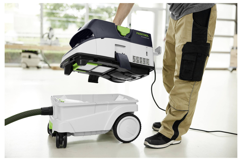 A CLEANTEC CTM 26 EI AC az elődjéhez képest hatékonyabb AUTOCLEAN főszűrő-tisztítással tűnik ki. Ezáltal biztosítható az állandóan magas szívóteljesítmény, a hosszabb munkaidőközök és a szűrő hosszabb élettartama kevesebb karbantartás mellett. Érintőképernyős vezérlőkkel a porszívó intuitív kezeléséhez. Fixen beépített Bluetooth® interfésszel a porszívó automatikus indításához Festool akkus géppel vagy opcionális távirányítóval. A porszívó a Festool alkalmazáshoz is csatlakoztatva van, ahol például beállíthatja a tisztítási intervallumokat. A sima, antisztatikus szívótömlő kényelmesen tárolható a beépített tömlőtárolóban.