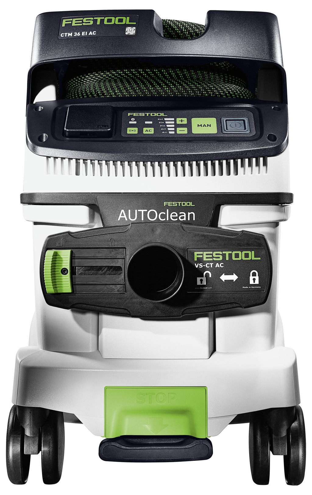 A CTM 36 EI AC RENOFIX elemében van, ha nagyon nagy mennyiségű porral kell megbirkózni, például a felújítási marógépekkel és gyémántcsiszolókkal végzett munka során keletkező porral. Elődjéhez képest hatékonyabb AUTOCLEAN főszűrő-tisztító rendszerrel rendelkezik. Ezáltal biztosítható az állandóan magas szívóteljesítmény, a hosszabb munkaidőközök és a szűrő hosszabb élettartama kevesebb karbantartás mellett. Érintőképernyős vezérlőkkel a porszívó intuitív kezeléséhez. Egy fixen telepített Bluetooth® interfész segítségével automatikusan indítható, vagy csatlakoztatható a Festool alkalmazáshoz, amivel például szabályozhatók a tisztítási intervallumok. A sima, antisztatikus szívótömlő kényelmesen tárolható a beépített tömlőtárolóban.